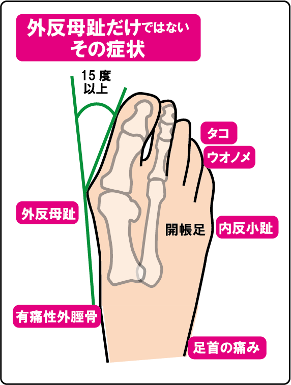 外反母趾は、足の親指が内側に曲がることで関節が変形し、足の親指の付け根が突出する状態です。この変形により、親指が隣の指に押される形になり、隣の指も歪んでしまうことがあります。