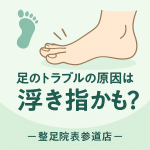 浮き指とは? 浮き指とは、立っているときや歩いているときに足の指が地面につかず、浮いてしまっている状態を指します。 本来、足の指は地面をつかみ、歩行やバランスを支える大切な役割を持っています。しかし、 ...